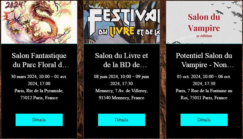 Le salon 2019 s’est achevé après près de trois jours, et comme toujours une expérience très enrichissante. Et pour vous  retrouver, lecteurs et amis écrivains et éditeurs, sachez d’ores et déjà que je serais présente au prochain Salon Fantastique sur le stand de mon éditeur 5 Sens Editions pour les 29 et 30 aout 2020. Cette fois, il se déroulera dans les magnifiques jardins du Parc Floral de Vincennes !