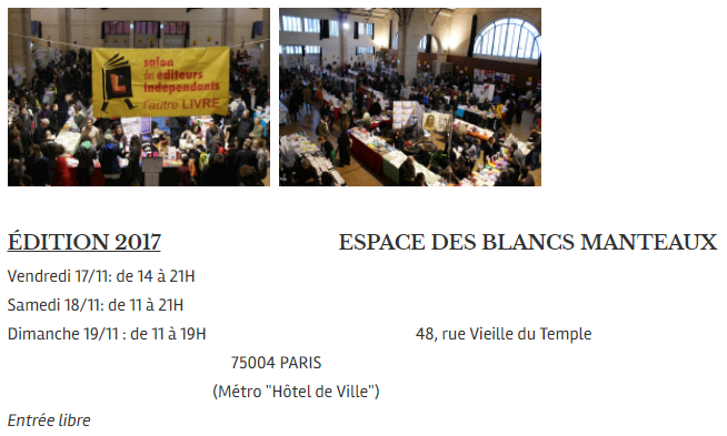 Un mot sur l’association L’Autre Livre qui organise ce salon et défend les droits de l’édition indépendante, permettant que la culture ne se cantonne pas aux limites imposées par les grandes filières commerciales mais s’ouvre et se développe ainsi que le veut l’art sans frontière.